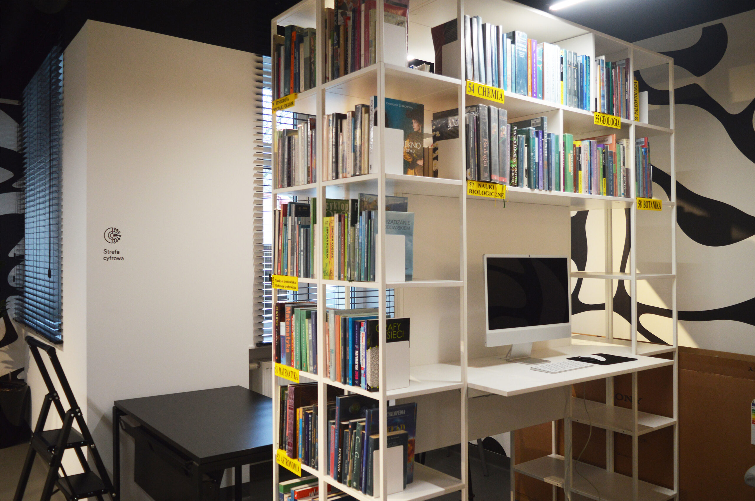 Każdy obiekt użyteczności publicznej powinien posiadać funkcjonalny system identyfikacji przestrzennej (wayfinding). Taki system miałem przyjemność zaprojektować dla nowej siedziby Filii nr 2 Biblioteka Publiczna im. Stefana Rowińskiego w Ostrowie Wielkopolskim. Powstały oznaczenia dla poszczególnych stref na parterze (Strefa seniora, Strefa dziecka, Strefa warsztatowa, Galeria i Czytelnia), oraz strefy znajdujące się na piętrze (Strefa planszówek, Wypożyczalnia, Strefa cyfrowa, Strefa analogowa oraz Terytorium żółwia Stefka — żywej maskotki biblioteki 🙂 Oznaczone zostały również toalety oraz pomieszczenia służbowe.